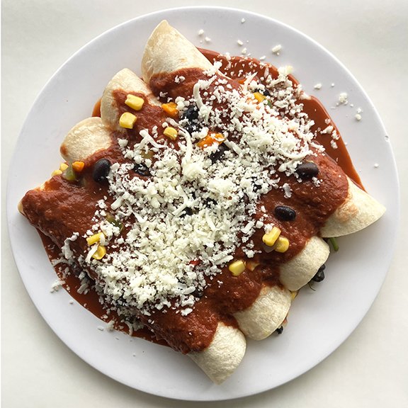 Local black beans, red and green peppers, onions, garlic, corn, and cilantro are mixed together, then rolled into flour tortillas and topped with our own red enchilada sauce with cocoa and chipotle, and mozzarella cheese. Bake. Two enchiladas per serving.